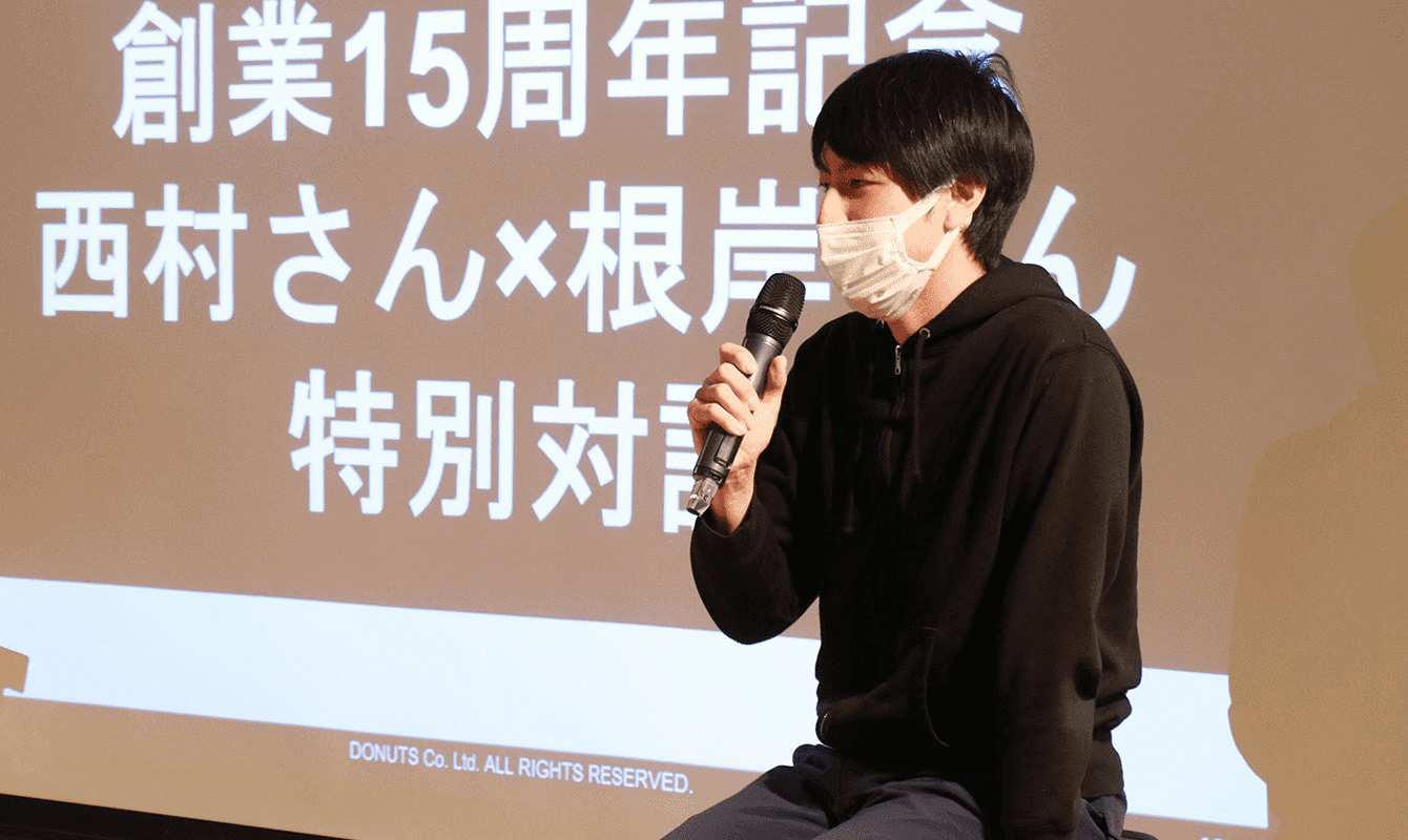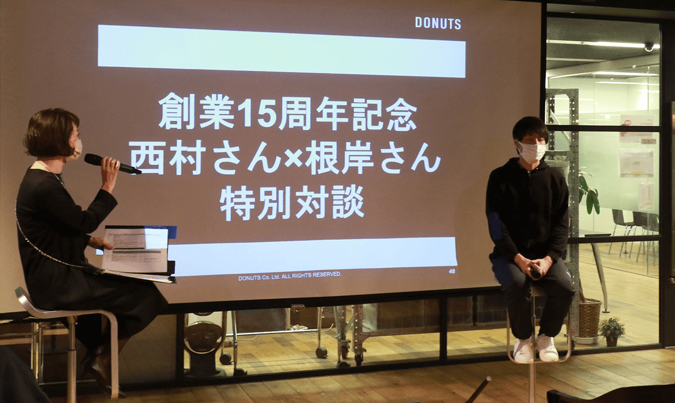 これを記念して、約3年ぶりに代表取締役 西村×取締役 根岸の15周年特別対談が、DONUTSの全社会で実現。