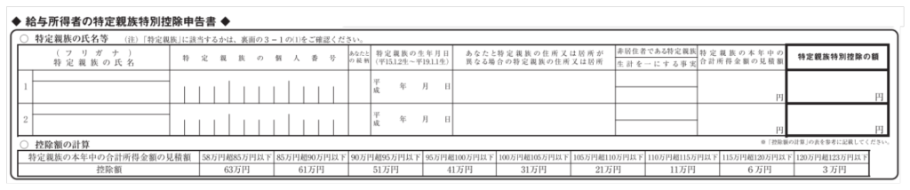 「給与所得者の特定親族特別控除申告書」の作成、特定親族特別控除額の計算および各帳票への反映が行えます。