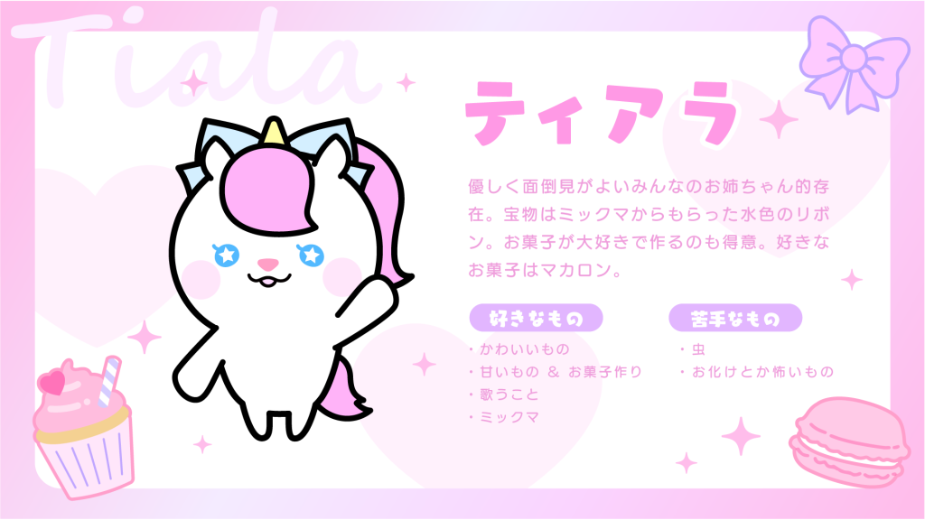 優しく面倒見がよいみんなのお姉ちゃん的存在。宝物はミックマからもらった水色のリボン。お菓子が大好きで作るのも得意。好きなお菓子はマカロン。