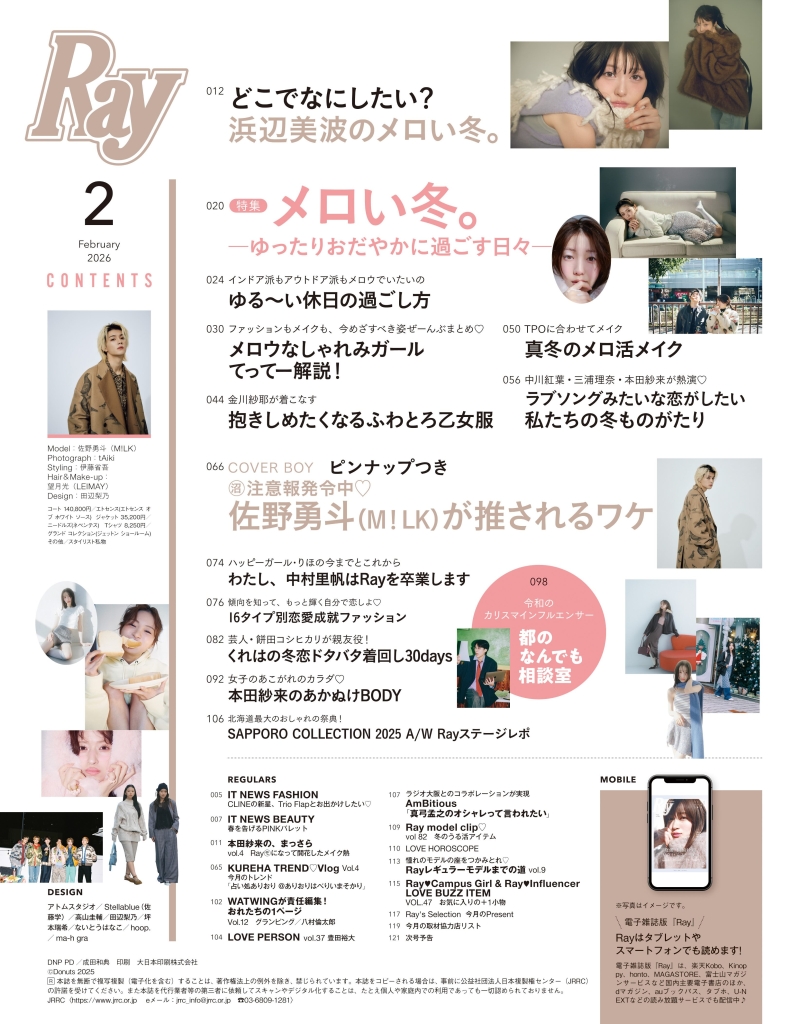 『Ray』2026年2月号は12月23日(火)発売!通常版は浜辺美波さんが2度目の表紙、特別版は佐野勇斗さん(M!LK)が『Ray』初表紙を飾る! 高橋璃央さん、都さん、豊田裕大さんらが登場する今号の大特集テーマは「メロい冬。」!さらに中村里帆が専属モデルを卒業!