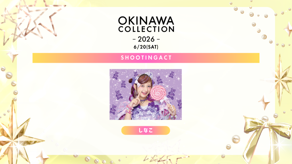 シューティングアクトとして、2024年に「しなこワールド」でアーティストデビューし、ミュージックビデオは4,200万回再生を突破、同年の「TikTokクリエイター影響力トレンドランキング」(モデルプレス)で1位を獲得するなど、α世代の憧れの存在として注目を集めるしなこの出演が決定しました。およそ2年ぶりとなるオキコレでのパフォーマンスにご期待ください。