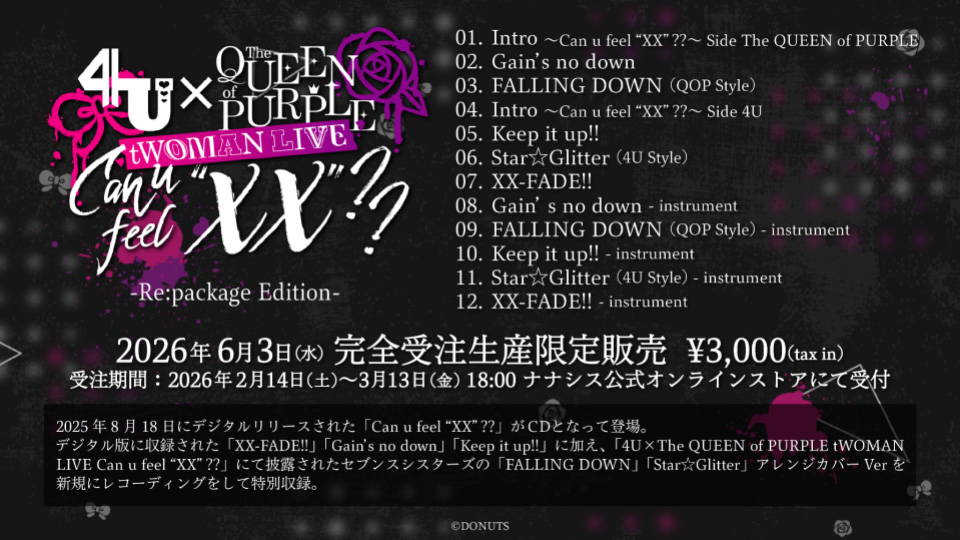 2025年8月に開催された4U、The QUEEN of PURPLEの対バンライブ「4U×The QUEEN of PURPLE tWOMAN LIVE Can u feel XX??」で披露された新曲「Gain's no down」、「XX-FADE!!」、「Keep it up!!」、およびカバー楽曲「FALLING DOWN」、「Star☆Glitter」を収録したCDの発売が決定!現在ナナシスオフィシャルストアにて予約受付中です。