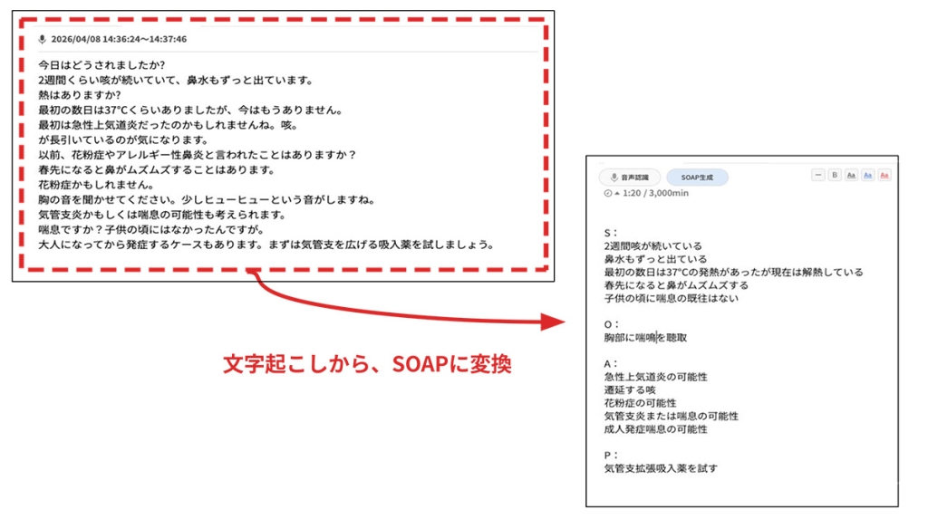 文字起こしし、SOAP形式の診療記録を自動生成する「音声認識&SOAP生成機能」の提供を開始しました。両機能により、経営判断から日々のカルテ記録までをAIで一気通貫で支援し、医療従事者の業務負荷軽減と、より「患者様に向き合った医療現場の実現」を加速します。